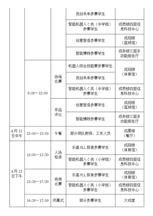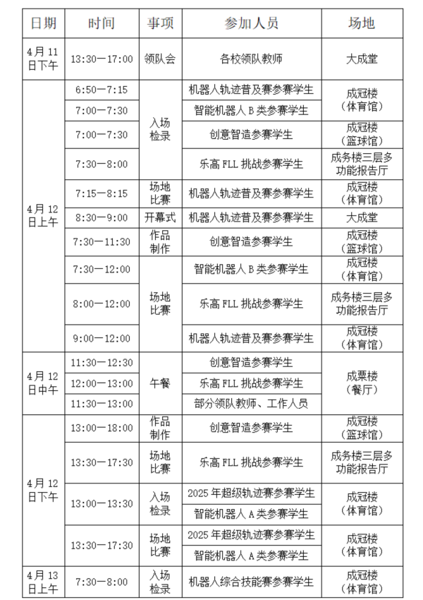 4.学生参赛使用的机器人、器材、笔记本电脑、电源延长线及电池等,由各参赛队按照比赛规则自行准备。学生不得携带食品饮料、易燃易爆品、管制刀具、干燥剂等任何有安全隐患及危险物品入场,如违反赛事规定,自行承担后果。参赛学生在检录结束后15分钟内仍未到场,视为弃赛。