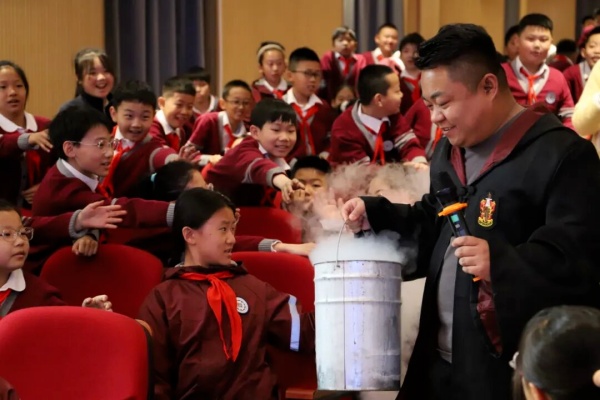 首场活动在西山小学报告厅举行,现场气氛热烈,充满奇趣。活动以一场精彩纷呈的科学表演秀为主线,由专业科普老师通过一系列设计精巧、现象震撼的科普实验,将深奥的科学原理以直观、有趣的形式呈现给师生。“掌中火”实验生动展示了丁烷气体燃烧与热量传递的奥秘,强调了安全操作的重要性;“七彩火焰”让同学们直观认识了不同金属元素的焰色反应;液氮实验环节更是将活动推向高潮,通过“液氮大炮”、物质脆化、液化现象等演示,揭示了极低温状态下的物理变化;“铁签穿气球”巧妙阐释了高分子材料的弹性力学原理;“消失的颜色”则引发了大家对氧化还原等化学反应现象的无限思考。每一个实验都配有深入浅出的原理讲解,科普老师注重引导同学们观察现象、提出问题、联系生活,在互动体验中感悟科学魅力,掌握科学方法。同学们全程聚精会神,踊跃参与,在惊叹与欢笑中激发了浓厚的科学兴趣和探索欲望。